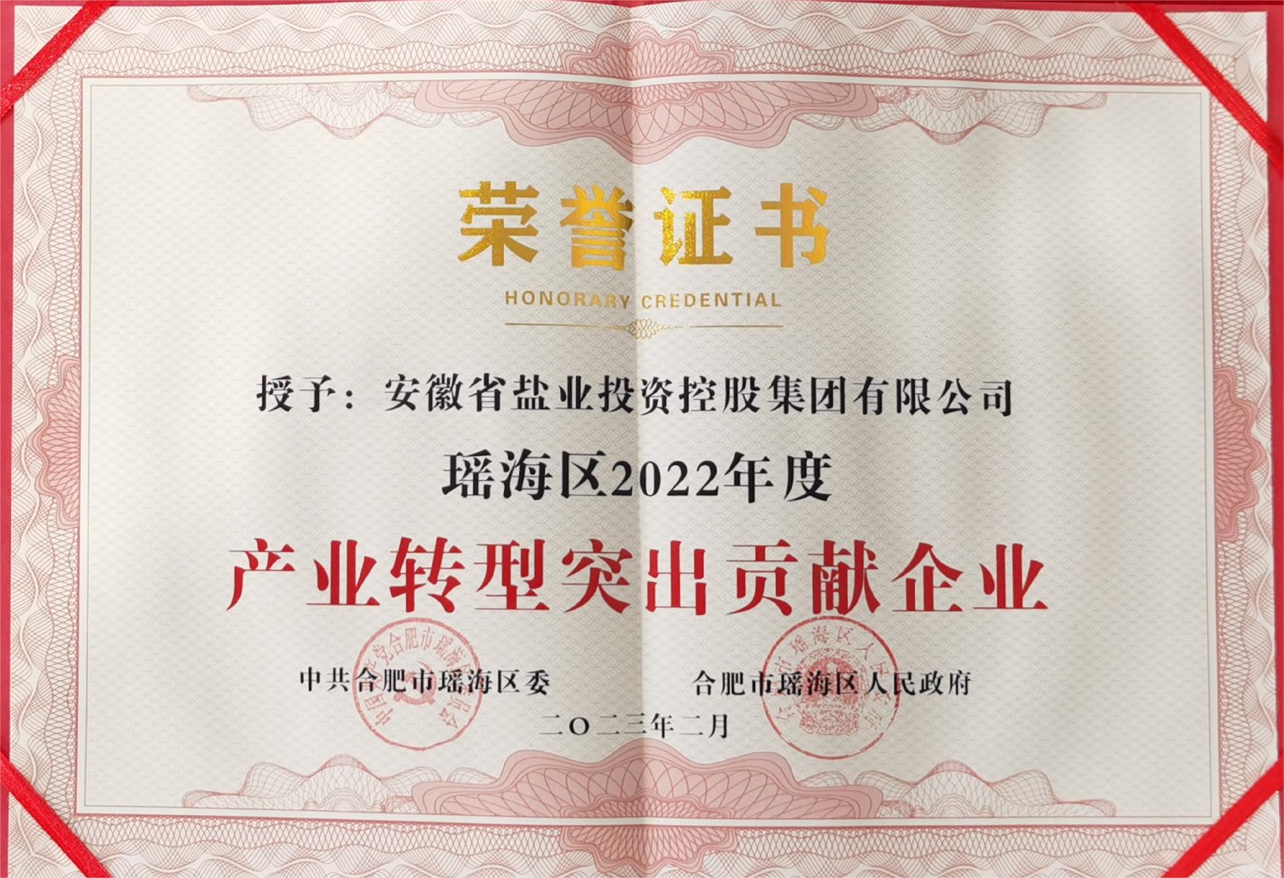 近日,省鹽業(yè)集團獲得瑤海區(qū)委、區(qū)政府授予的瑤海區(qū)2022年度“產業(yè)轉型突出貢獻企業(yè)”榮譽稱號。
