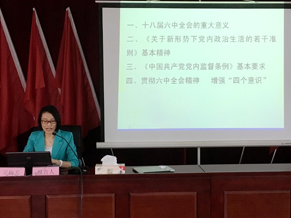 吳梅芳教授從全面從嚴(yán)治黨的高度,深刻闡述了黨的十八屆六中全會的重大意義,緊緊圍繞加強(qiáng)和規(guī)范黨內(nèi)政治生活的重要性等四個(gè)方面對《關(guān)于新形勢下黨內(nèi)政治生活的若干準(zhǔn)則》進(jìn)行了重點(diǎn)解讀,并就《中國共產(chǎn)黨黨內(nèi)監(jiān)督條例》修訂的內(nèi)容和特點(diǎn)等方面作了提煉分析,對學(xué)習(xí)貫徹黨的十八屆六中全會精神、不斷強(qiáng)化“四個(gè)意識”提出了具體要求。她的報(bào)告系統(tǒng)全面,層次分明,站位高、解讀準(zhǔn)、接地氣,既有理論深度,又有生動實(shí)例,對廣大黨員干部學(xué)習(xí)領(lǐng)會和掌握黨的十八屆六中全會精神,全面提升企業(yè)黨建工作水平具有重要的指導(dǎo)意義和促進(jìn)作用。