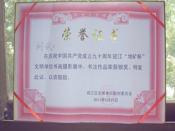 樅陽(yáng)公司劉武同志書法作品獲銀獎(jiǎng)