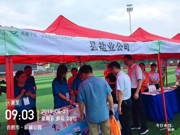 按照統(tǒng)一部署,6月21日早晨,長(zhǎng)豐縣鹽業(yè)公司5名工作人員早早就來(lái)到了活動(dòng)現(xiàn)場(chǎng),帶著《食鹽專營(yíng)辦法》等宣傳資料、品種鹽樣品及訂制的水杯參加宣傳活動(dòng)。啟動(dòng)儀式開(kāi)始后,首先由縣政協(xié)副主席致辭;接著是合肥伊利乳業(yè)有限責(zé)任公司代表食品生產(chǎn)企業(yè)作承諾發(fā)言;后由縣人大副主任宣布“長(zhǎng)豐縣2019年食品安全宣傳周暨食品安全長(zhǎng)豐行活動(dòng)正式啟動(dòng)”并會(huì)同場(chǎng)上領(lǐng)導(dǎo)共同按下儀式啟動(dòng)球。活動(dòng)現(xiàn)場(chǎng)人群涌動(dòng),氣氛熱烈,長(zhǎng)豐公司5名工作人員穿著統(tǒng)一T恤,佩戴著工作證,分別在兩個(gè)展臺(tái)開(kāi)展宣傳。主要宣傳《食鹽專營(yíng)辦法》、講解多品種鹽知識(shí),推崇“吃好鹽 選中鹽”,吃鹽首選“綠色食品鹽”的健康理念。