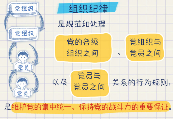 組織紀律著眼于黨員和黨組織之間的關系,規(guī)范的是黨組織和黨員遵守和維護黨在組織上團結統(tǒng)一的行為。一個人一旦入了黨,就要有強烈的組織意識和組織觀念,就必須嚴格遵守組織紀律。