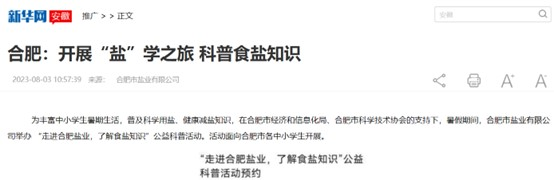 2023年7月,合肥鹽業(yè)自1950年成立以來首次對(duì)外開放,面向全市中小學(xué)生,開展“鹽”學(xué)之旅,食鹽科普游活動(dòng),活動(dòng)內(nèi)容包括參觀60年歷史的鐵路專用線、省市食鹽儲(chǔ)備倉庫,食鹽健康科普講座,7月份接待來自國內(nèi)外7所中小學(xué)校170名學(xué)生和家長,8月份已預(yù)約8場食鹽科普游。