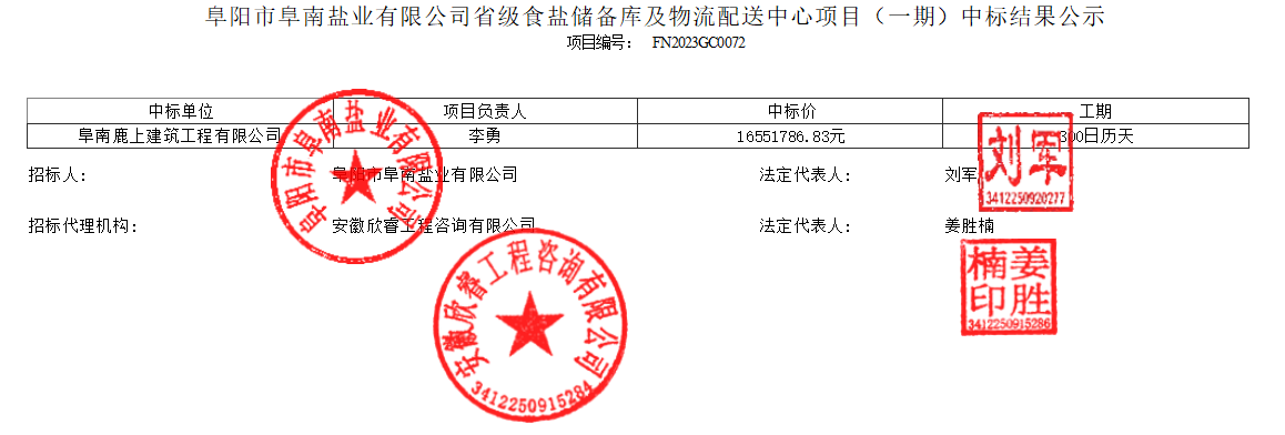 阜陽市阜南鹽業(yè)有限公司省級食鹽儲備庫及物流配送中心項目(一期)中標結果公示