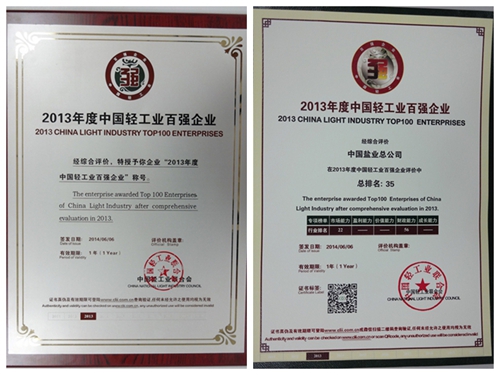 6月6日,中國輕工業(yè)聯(lián)合會(huì)在北京京西賓館舉辦了以“新經(jīng)濟(jì)、新模式、新視角”為主題的“第三屆中國輕工企業(yè)家高峰論壇暨輕工百強(qiáng)企業(yè)頒獎(jiǎng)盛典”。大會(huì)發(fā)布了“2013年度中國輕工業(yè)百強(qiáng)企業(yè)”榮譽(yù)榜單,中鹽總公司榮獲“2013年度中國輕工業(yè)百強(qiáng)企業(yè)”稱號(hào),在2013年綜合百強(qiáng)榜單中排名35位,并獲市場(chǎng)能力專項(xiàng)排名第22名。