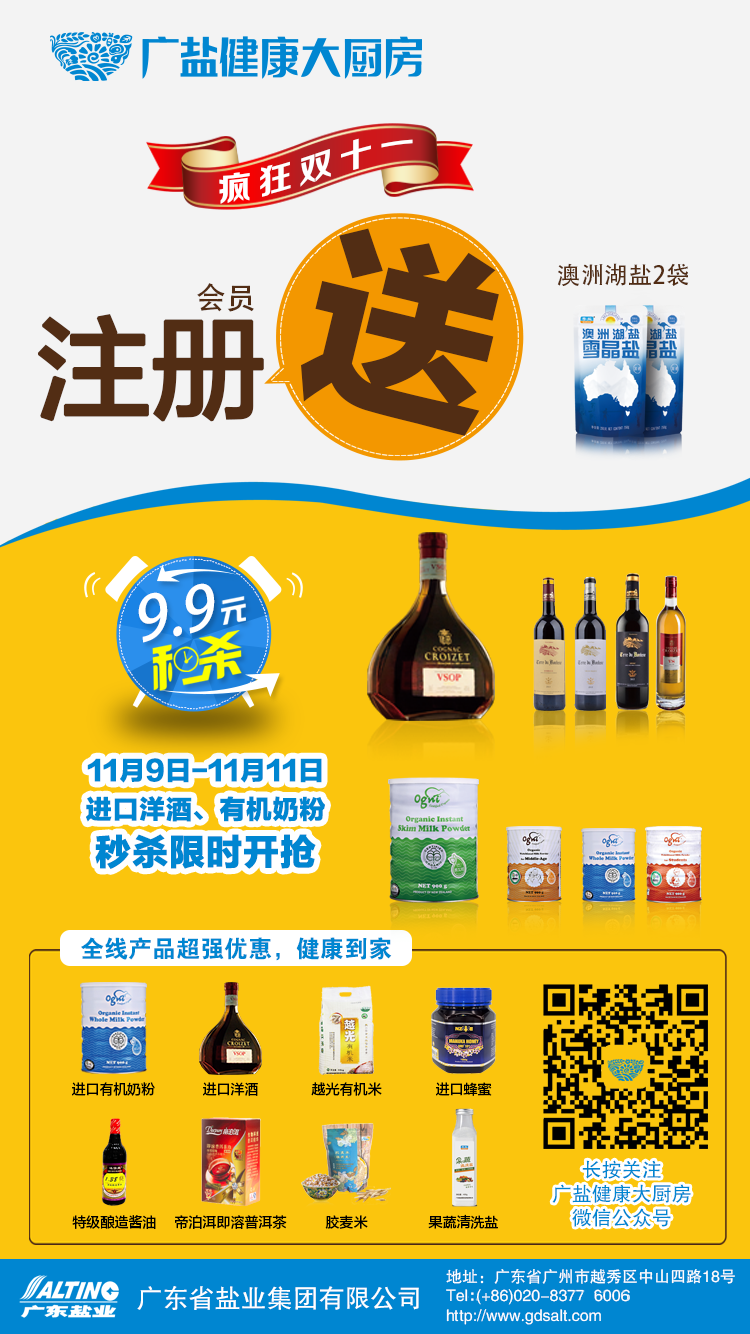 廣東省鹽業(yè)集團在11月組織開展全省統(tǒng)一的廣鹽健康大廚房“雙11” 營銷活動?;顒悠陂g,用戶關(guān)注“廣鹽健康大廚房”微信公眾號(微信號:gyjkdcf)并注冊為會員的,每人均可免費獲贈兩包澳洲湖鹽(250g),另外還有多款商品限時“9.9元秒殺”及全場打折優(yōu)惠活動,活動詳情及參與方式請大家關(guān)注廣鹽健康大廚房。