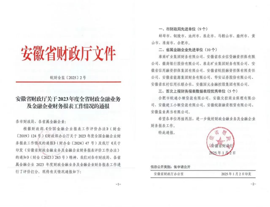 近日,安徽省財政廳依據(jù)《全國金融企業(yè)報表工作評價辦法》等相關(guān)文件精神,對各市財政局和省屬金融企業(yè)2023年度財政金融業(yè)務(wù)及金融企業(yè)財務(wù)報表工作進行了評價?;整}典當(dāng)公司榮獲“首次上報財務(wù)報表數(shù)據(jù)表現(xiàn)優(yōu)秀單位”榮譽稱號。