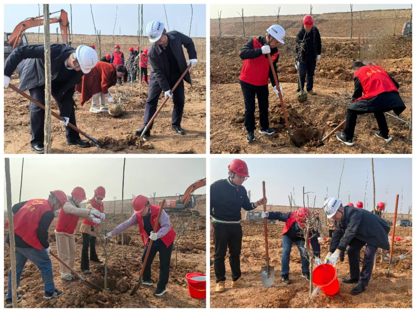 全體人員到達(dá)植樹地點(diǎn)后,拿起工具熱情高漲地投入到植樹活動(dòng)中?;顒?dòng)現(xiàn)場,大家分工協(xié)作,揮鍬培土、扶苗填坑、澆水灌溉,配合默契,干勁十足,有條不紊地將樹苗植入土中。為了提高樹苗的存活率,大家細(xì)心地用鐵鍬一點(diǎn)點(diǎn)鏟碎結(jié)塊的土壤,用細(xì)節(jié)傳承國企品質(zhì)。經(jīng)過大家的辛勤勞動(dòng),一棵棵新栽的樹苗迎風(fēng)挺立,萌發(fā)盎然生機(jī),與施工現(xiàn)場的機(jī)械轟鳴聲交相輝映,勾勒出一幅“綠色與建設(shè)共生”的生動(dòng)畫面。