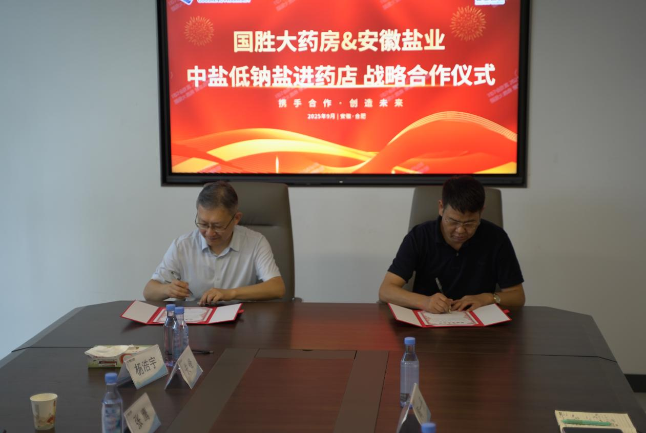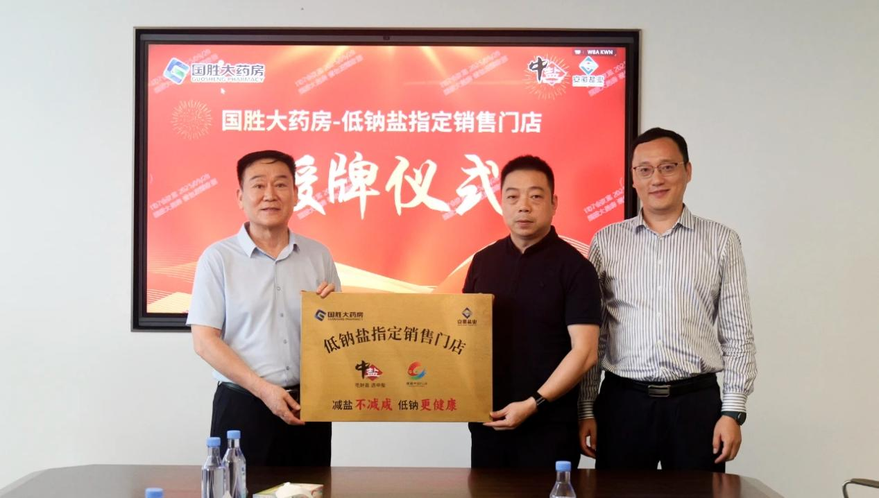 儀式現(xiàn)場,雙方圍繞“高鹽飲食危害防控”與“低鈉鹽全民推廣路徑”展開深入研討,達成了“政策同向、使命同頻”的戰(zhàn)略共識,共同致力于將健康干預覆蓋至家庭單元。隨后,安徽省鹽業(yè)集團與國勝大藥房簽署了戰(zhàn)略合作協(xié)議,安徽省鹽業(yè)集團與中鹽東興公司共同向國勝大藥房授予“中鹽低鈉鹽指定銷售門店”牌匾,宣告低鈉鹽的健康推廣與銷售在醫(yī)藥渠道正式啟動。